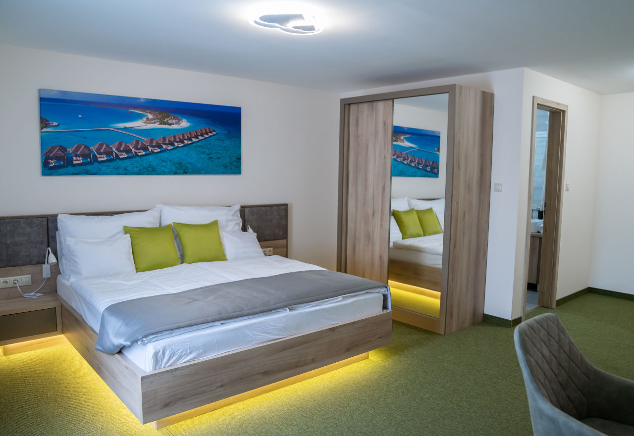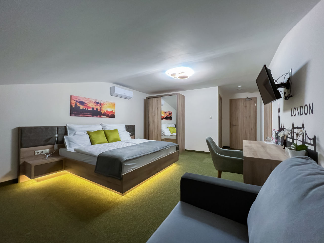 Generálkivitelezési projektünk keretében egy multifunkciós kereskedelmi egységet építettünk át Taksonyban. A meglévő 2 szintes épület földszintjén egy bisztrót, az emeleten egy 12 szobás, 4*-os szálloda szinvonalának megfelelő panziót alakítottunk ki a designer tervek alapján, a megújult épületet 2020-ban adtuk át.